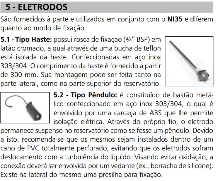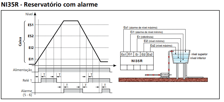 O controlador eletrônico de nível para líquidos condutivos e não inflamáveis NI35HR foi desenvolvido para controle de nível de reservatório (caixa d' água) com 2 saídas relé, sendo uma para controle da bomba e outra para alarme. O relé para controle energiza quando o nível mínimo for atingido, e desenergiza ao ser atingido o nível máximo. Além do controle possui a função de alarme para nível mínimo ou máximo que é ativado pela utilização de mais dois eletrodos e a segunda saída para sinalizar o alarme.