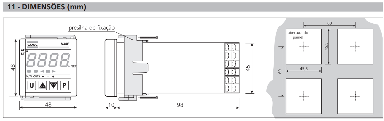 O controlador de temperatura K48E é instrumento de fácil programação. Trabalha com sinal de entrada de termoelementos tipo J, K, S, R, T ou termoresistência Pt100. A temperatura do processo é visualizada através de um display a LED com 4 dígitos e controlada por uma saída a relé. O controle é tipo ON/OFF ou PID, selecionado através do teclado frontal.